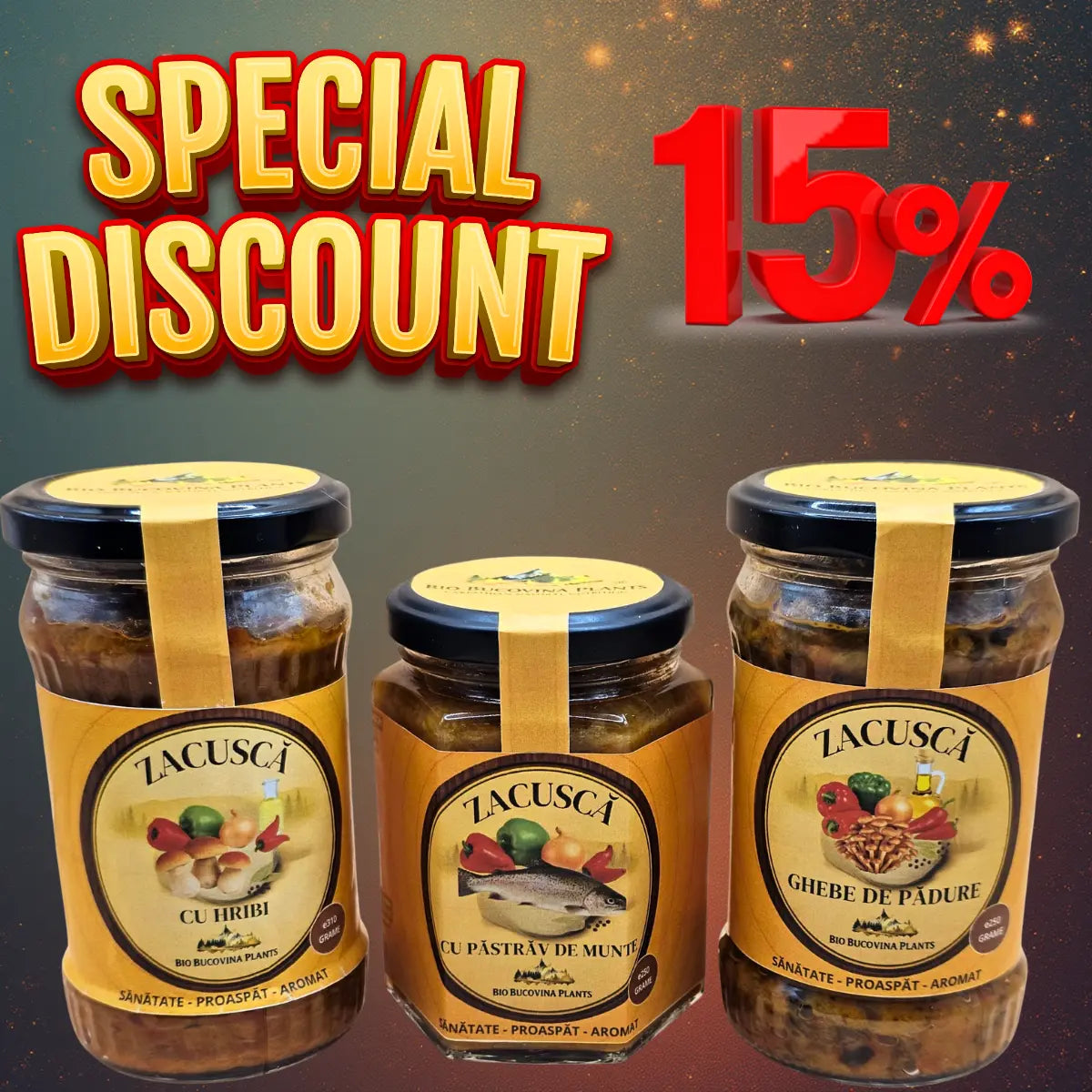 Zacuscă cu Hribi • Zacuscă cu Păstrăv de Munte • Zacuscă cu Ghebe de Pădure